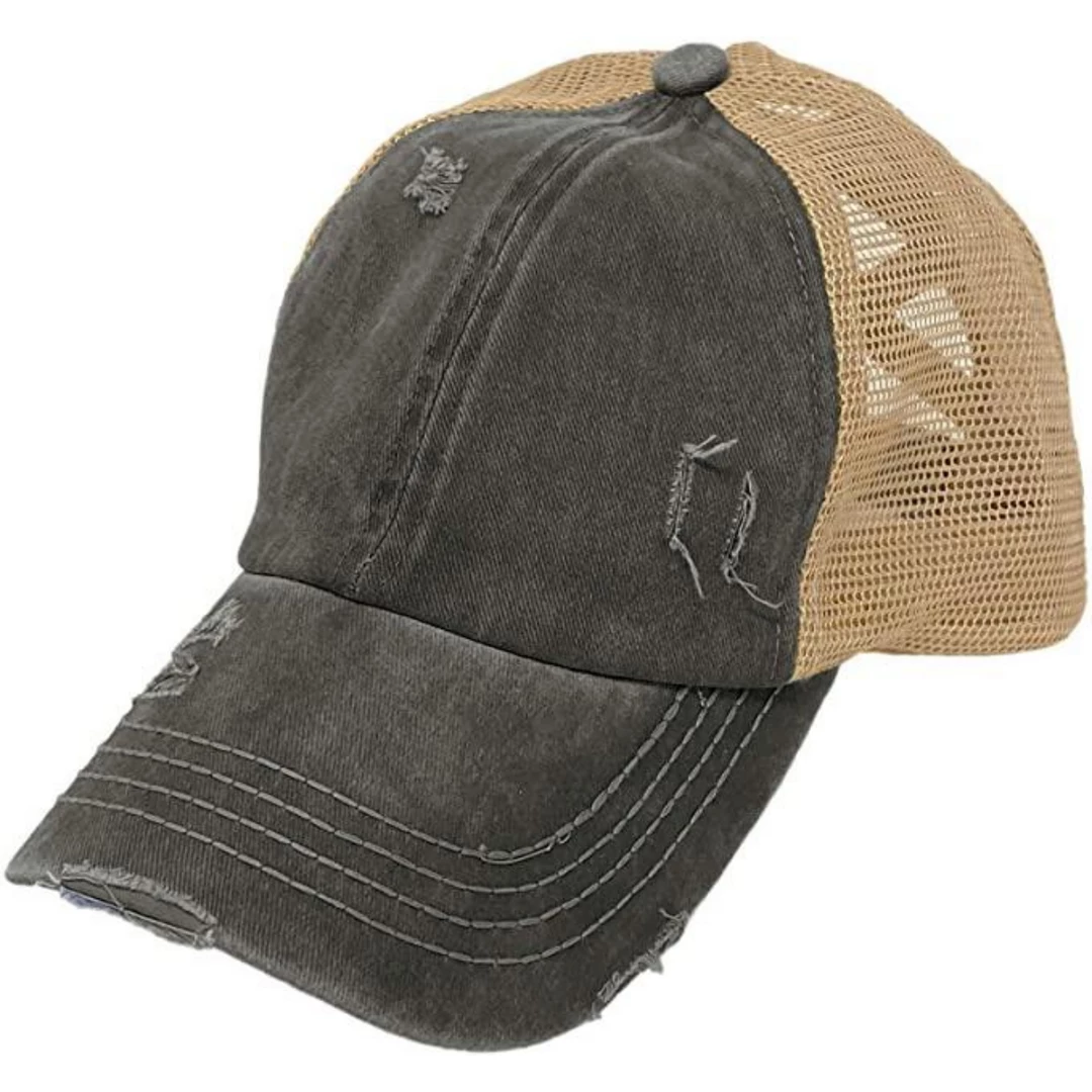BRAND NEW! This Distressed Black/Beige High Ponytail CC Ball Cap is your newest favorite ball cap! It features an ALL NEW HIGH PONY criss cross design allowing you to wear your pony at varying level with a trendy twist!