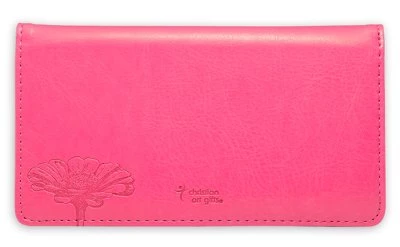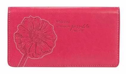 Classy floral design in orchid pink faux leather, enhanced with debossed Scripture verse quote from Matthew 19:26 “With God all things are possible.” Stitch-trimming, floral motif; soft and supple. Checkbook cover has interior slip pocket, 3 credit card slots, ID window, pen loop, plastic divider for duplicate checks. Measures 6.75″x 3.75″.