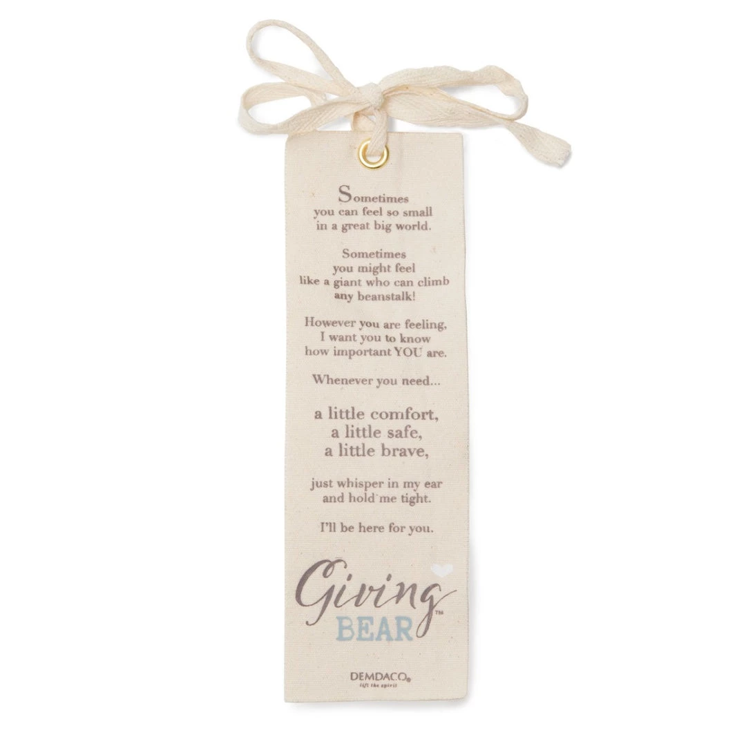 A special friend. This precious fellow comes with an endless supply of hugs, the perfect gift of comfort and love. More than just any stuffed animal, our special Giving Bear is designed to be given to someone, young or young at heart, who needs comforting. The friendly companion sits 12 inches tall and is lightly stuffed to form his floppy body. Soft touchable fabrics lend soothing comfort and love. His contrasting corduroy ear shows he is a good listener. Includes a special bookmark that carries his message: Sometimes you can feel so small in a great big world. Sometimes you might feel like a giant who can climb a beanstalk! However you are feeling, I want you to know how important YOU are. Whenever you need a little comfort, a little safe, a little brave, just whisper in my ear and hold me tight. I’ll be here for you. DEMDACO Giving Bear is a special companion to remind the recipient that a friend is always near. Plush, Measures 16 Inches