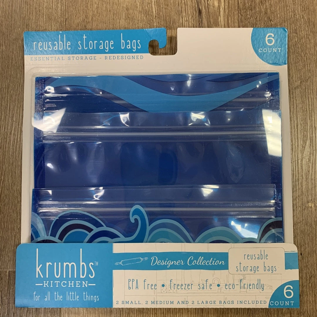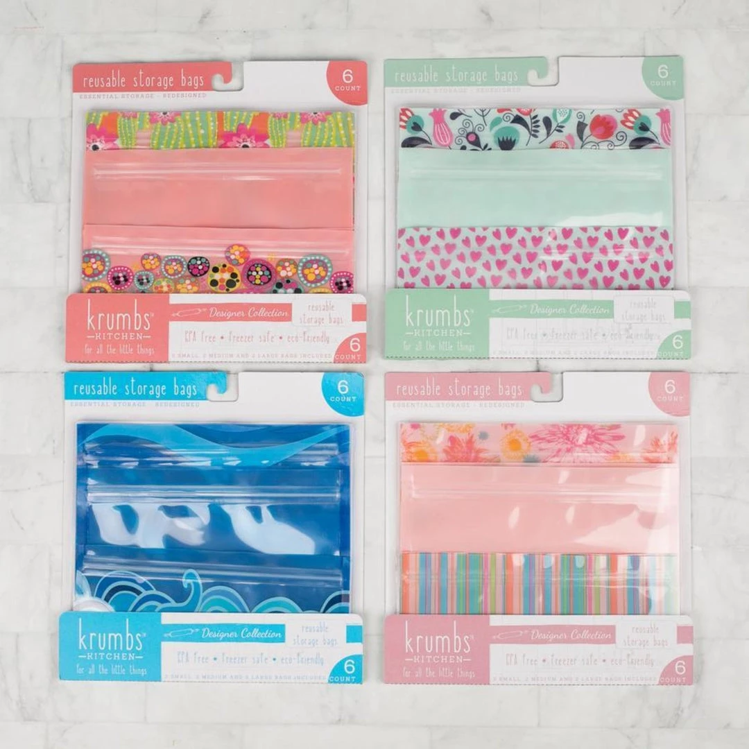6 pack of Reusable Zip Storage Bags. 2 of Each in Sizes: Small 3.25×8 inch, Medium 5.75×8 inch, Large 7×8 inch. Keep food fresh and the world a little greener with these reusable storage bags. Airtight seal allows food to last longer with pretty designs and colors. Each pack comes with two of each of the three sizes and a textured grip for easy opening – six bags total. Eco-friendly, waste-free, and budget-conscious alternative to one-time use bags. Top rack dishwasher safe, BPA free, and freezer friendly.Â