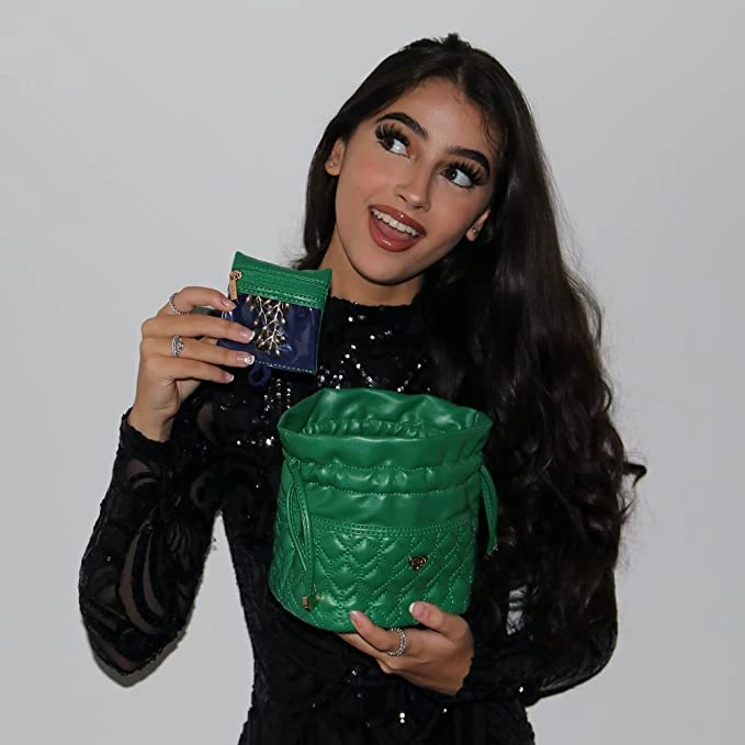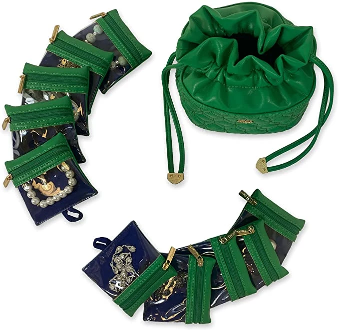 - ULTIMATE GIFT: Nine bright jewel tone colors to choose from, easy drawstring top, 10 removable clear view pouches, snapping strap at bottom to secure pouches, 2 inside snap pockets, dual purpose – converts from jewelry case to evening bag.