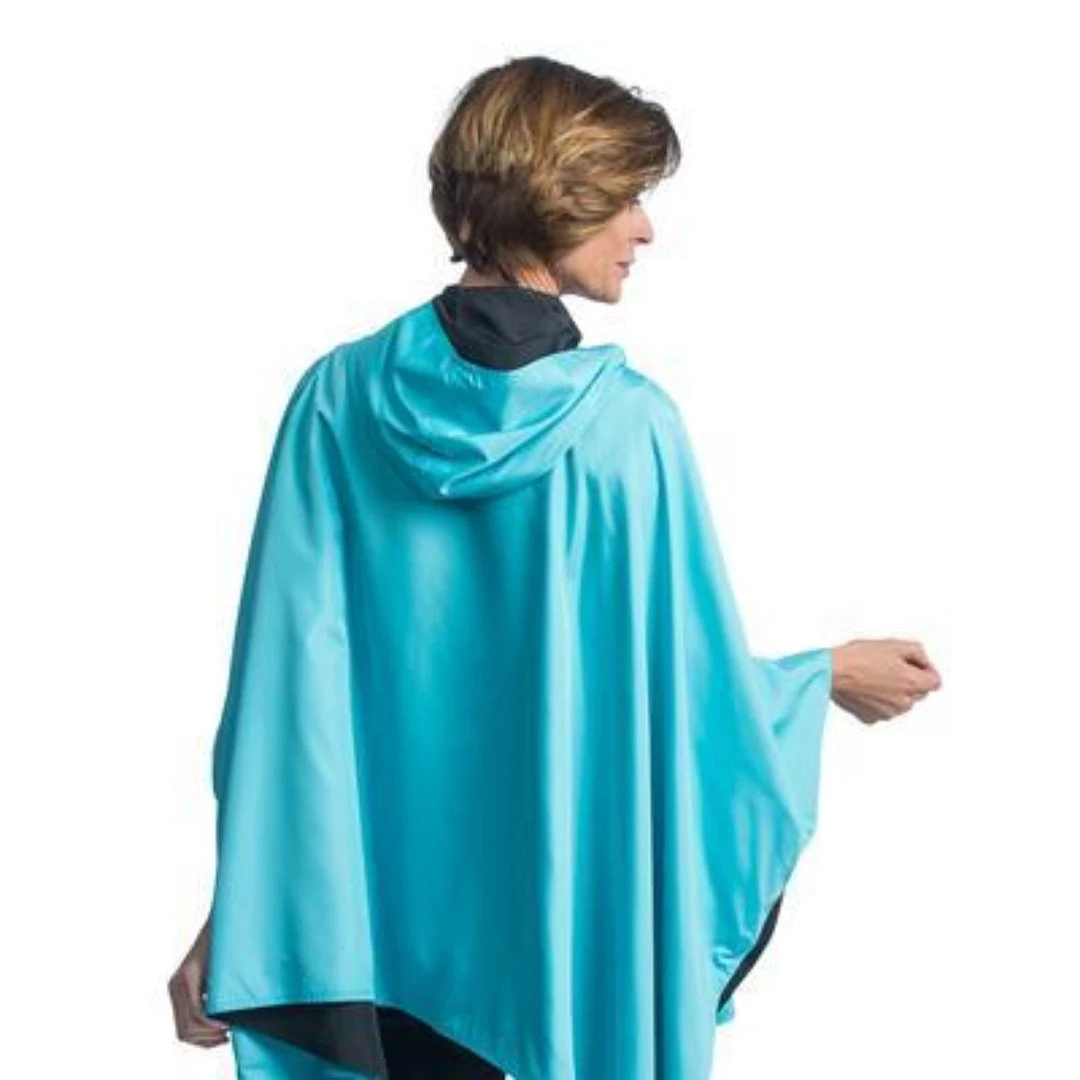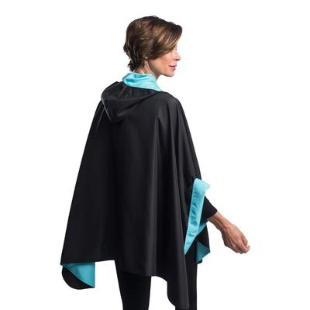 Make an impression in this distinctive Black and Sky Blue RainCaper – they’ll know you’ve arrived. More than a lightweight women’s rain poncho, the packable, rainproof and windproof travel cape offers effortless comfort and timeless style. Wrap yourself in the silky-soft, luxurious and supple fabric – this fashionable travel cape makes it clear you’re going places. Enjoy 2 looks in 1 – wear the Black side out for a look of understated elegance; reverse to Sky Blue for a cool and chic designer look that’s equally at home on land or at sea. Ideal for transitional weather, it may be worn as a cape alone, or wear it over a jacket or coat in cooler or rainy weather – the ultra-versatile RainCaper works drizzle or downpour, rain or shine.