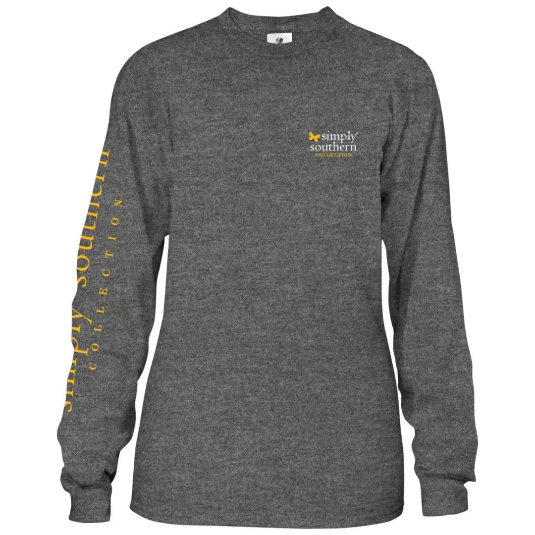 Dark heather gray long sleeve shirt with daisies and sunflowers in mason jars with butterflies; the phrase “Let you soul shine”; and the Simply Southern logo on the back. Small Simply Southern logo with a butterfly on the front chest. The Simply Southern logo along the right sleeve.