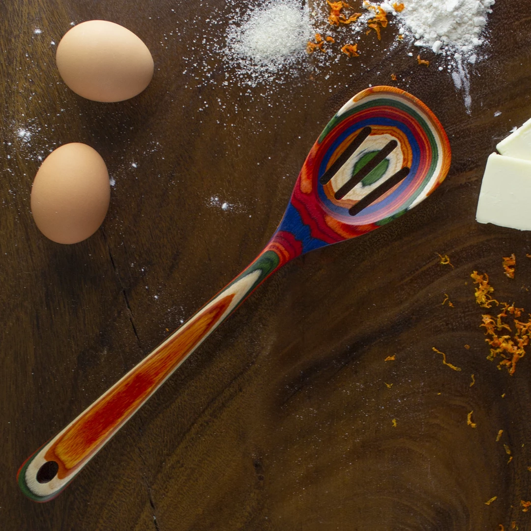Add a splash of warming color to your kitchen with the Baltique™ Marrakesh Collection Slotted Spoon. This eye-catching utensil is masterfully crafted from layers of colored birched wood to create a gorgeous color array. The Marrakesh Collection features a rainbow blend of red, green, orange, blue and natural wood colors. The colorway was inspired by the bright and colorful marketplaces of Morocco. This brightly colored slotted cooking spoon is wonderful for stirring and a delightful choice for serving that’s sure to draw attention from guests. At 12-1/2 inches long it can reach even the deepest of cooking pots and is safe for use on nonstick coatings! Includes a convenient hanging hole for easy storage and display. To clean, hand wash or wipe with a damp cloth; do not soak or wash in the dishwasher. Pair the slotted spoon with the other utensils in the Marrakesh Collection for a bright bouquet of color in your kitchen!